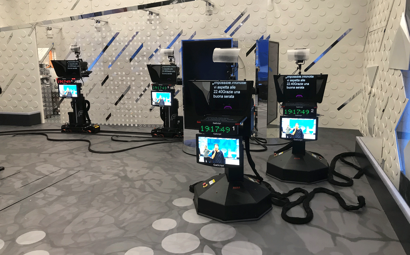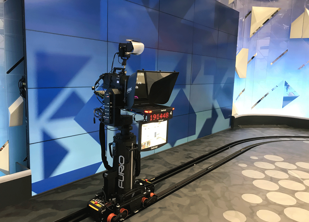 To create the desired dynamic look and feel, RSI got in touch with Miguel Declerck, Senior Business Development Manager for Ross Camera Motion Systems. “The moving desks posed some challenges in terms of the type of robots that could be used on the set floor. After thorough brainstorming with RSI, we proposed a hybrid solution consisting of two Furio SE’s on rails wrapped around the set to provide the spectacular wide-shots up to a camera view point of 2m20, and two free-roaming CamBot 600XY’s pedestals inside the set for the close-up shots. The result is one of the best mixed Furio-CamBot studios, both aesthetically and in terms of workflow efficiency.