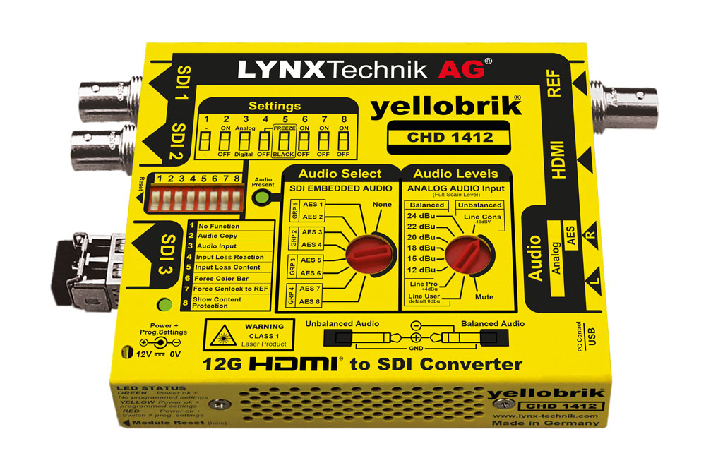 The CHD 1412 is a versatile and compact HDMI to SDI converter with integrated frame synchronizer. It is an ideal solution for any application which requires a fully synchronized SDI input from an external asynchronous HDMI source.
