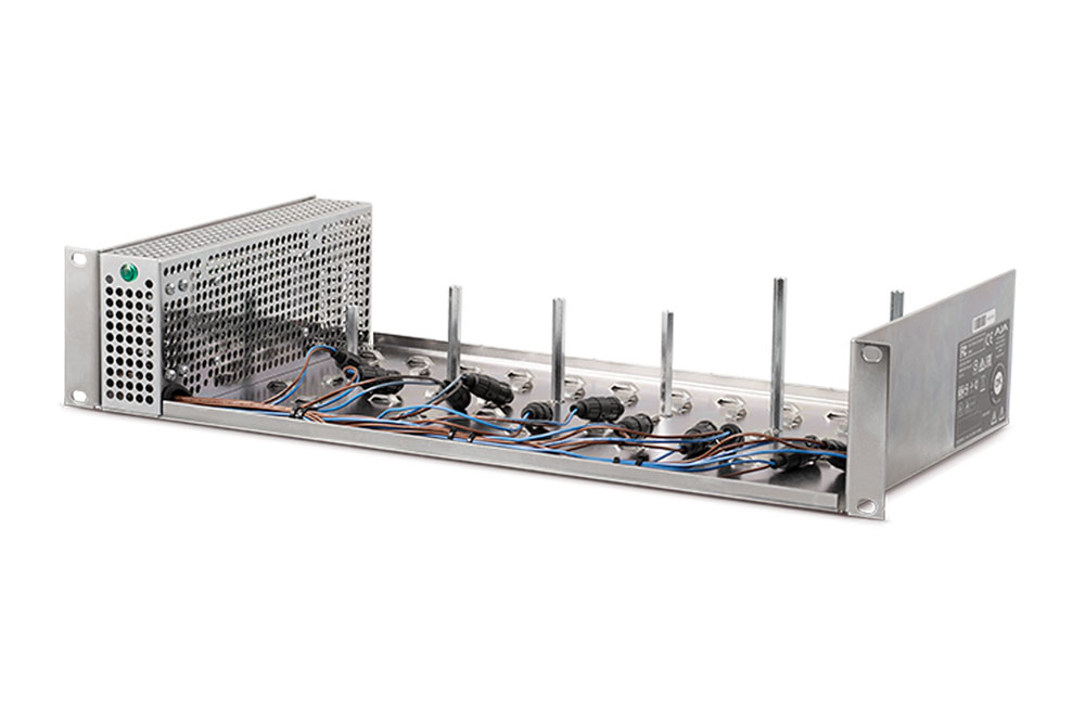 The DRM has a built-in 110/220V power supply with 12 connectors to provide 5V power directly to the Mini-Converters without the need for individual power supplies for each Mini-Converter.
