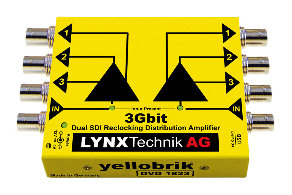 The DVD 1823 is a compact general purpose, dual channel reclocking SDI distribution amplifier suitable for any level A or Level B SDI video signal up to 3Gbit (1080p60) including DVB-ASI signals.