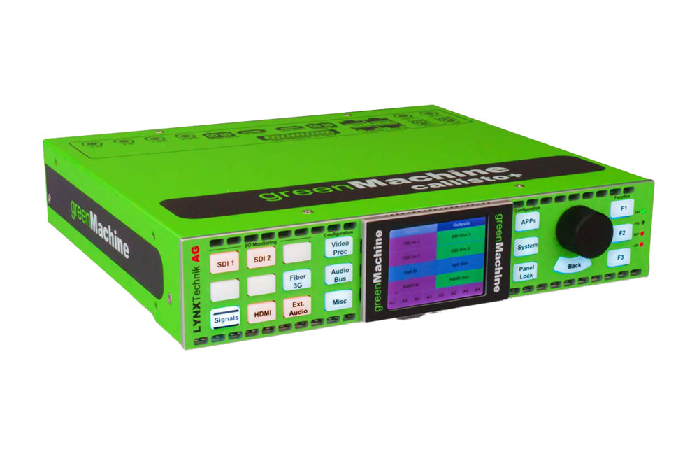 The greenMachine callisto+ platform provides for simultaneous processing of up to two individual SD/HD/3G SDI signals. The hardware itself is a powerful general-purpose audio and video processing appliance that can perform many different functions using one of the available greenMachine configurations (constellations), i.e. 2CUPXD.