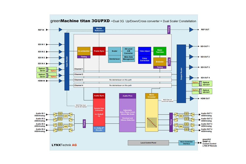The greenMachine titan hardware comes with a fully featured local control interface with an LCD which displays image previews and audio level meters of the processed video paths in addition to the graphical user interface. This greenMachine 3G UPXD package is also supported by the Nova controller which enables the module to be remotely controlled and monitored via third party master control software.