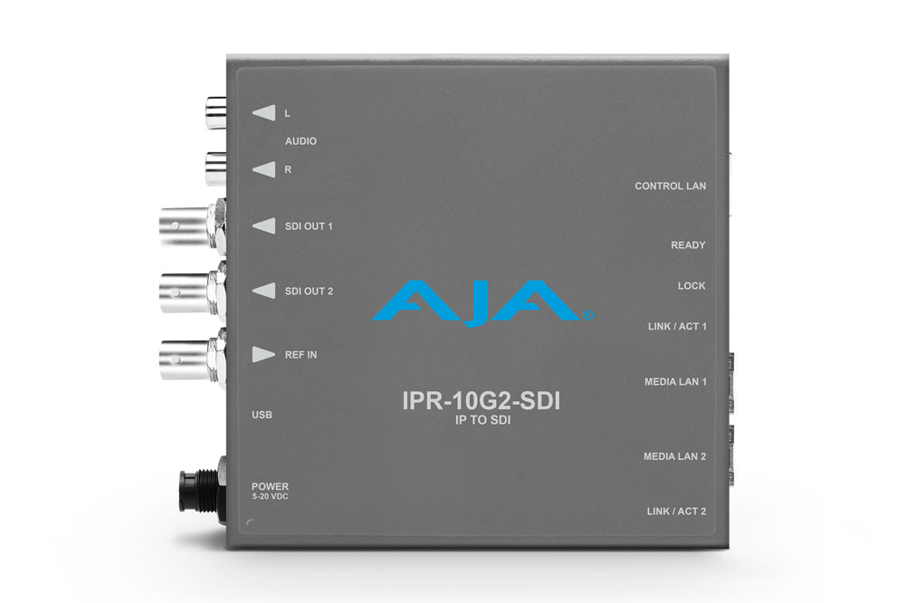 IPR-10G2-SDI extracts a SMPTE ST 2110 essence from an incoming IP stream and presents it for monitoring on, or routing to, HDMI devices. Providing two SFP cages for redundancy protection via „hitless switching“, IPR-10G2-SDI is rugged, quiet and fanless. AJA Mini-Converter design is ideal for placement in a wide range of display and device scenarios, from studios to field.