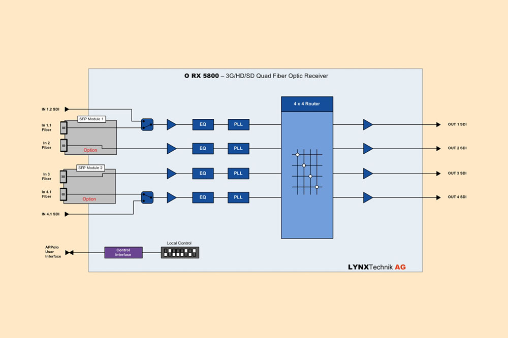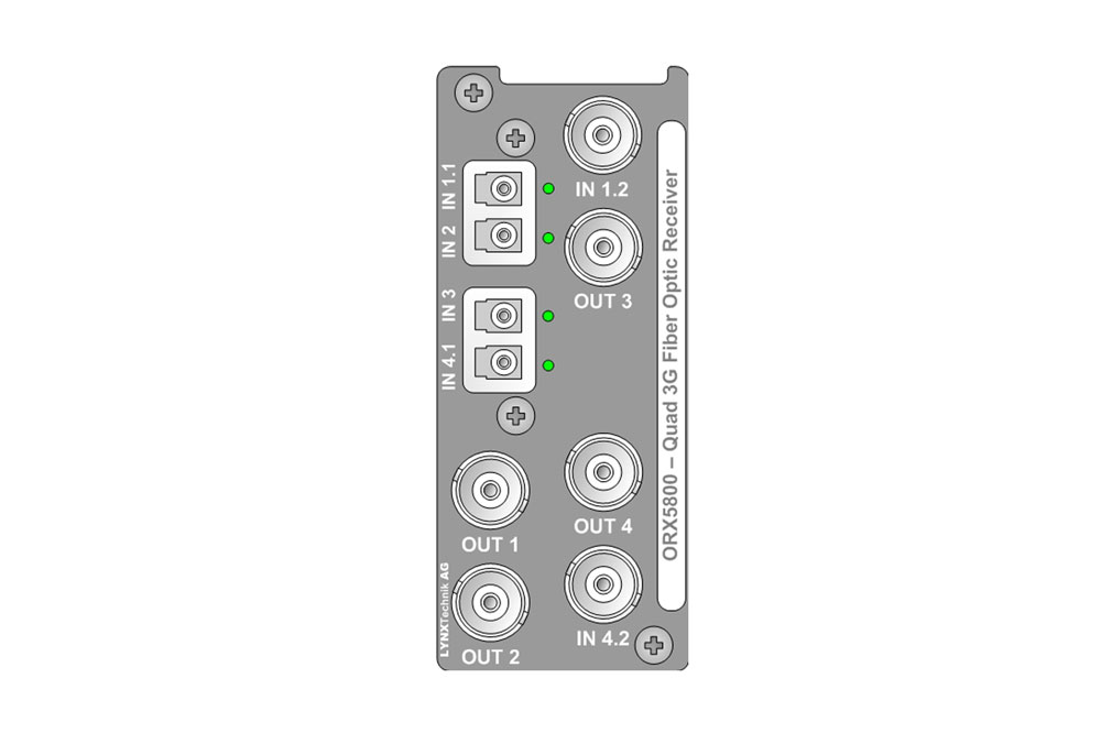 The ORX 5800 is a flexible four channel SDI optical to electrical converter for SDI/ASI-DVB video signals up to 3Gbit/s. Each channel has automatic input clock rate and signal presence detection with selectable signal reclocking. This module is ideally suited for demanding digital multi-format broadcast and professional applications.