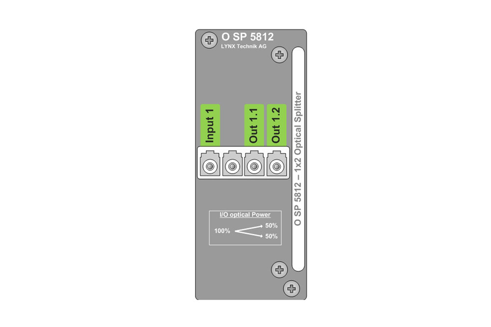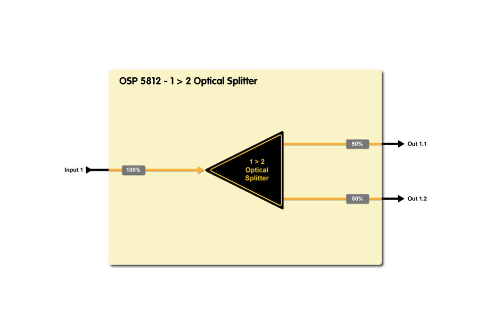 The OSP 5812 is a 1 > 2 optical splitter / combiner. The optical input is split into 2 outputs, each one having 50% of the input power.
