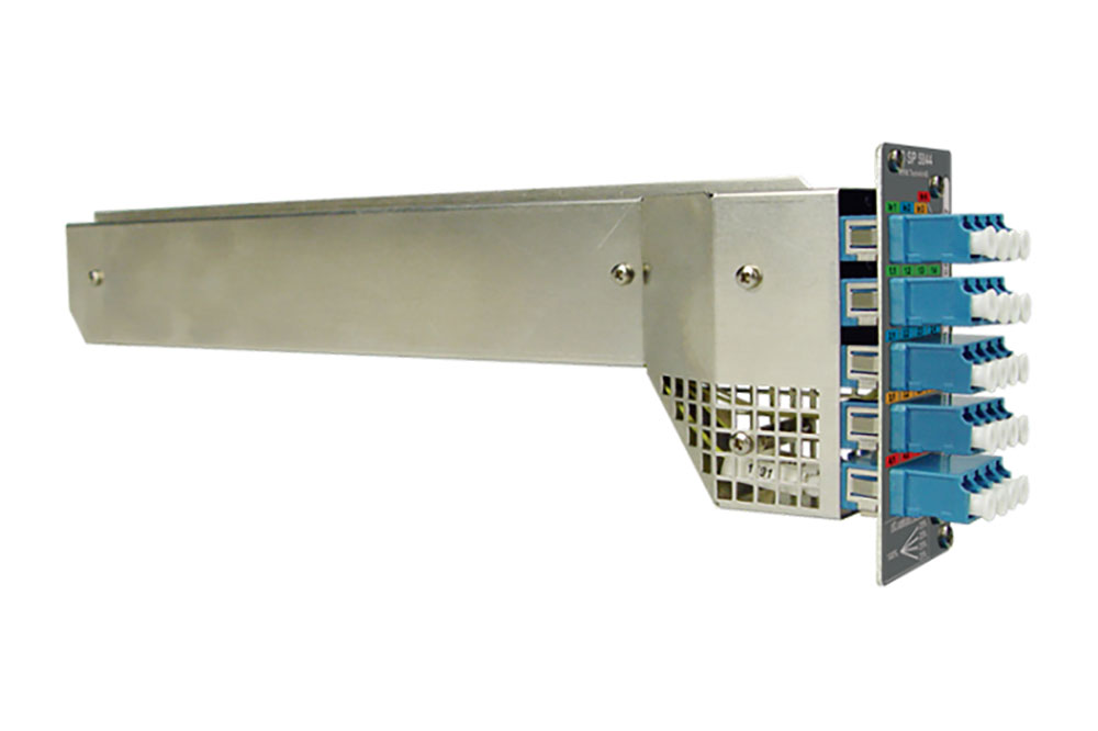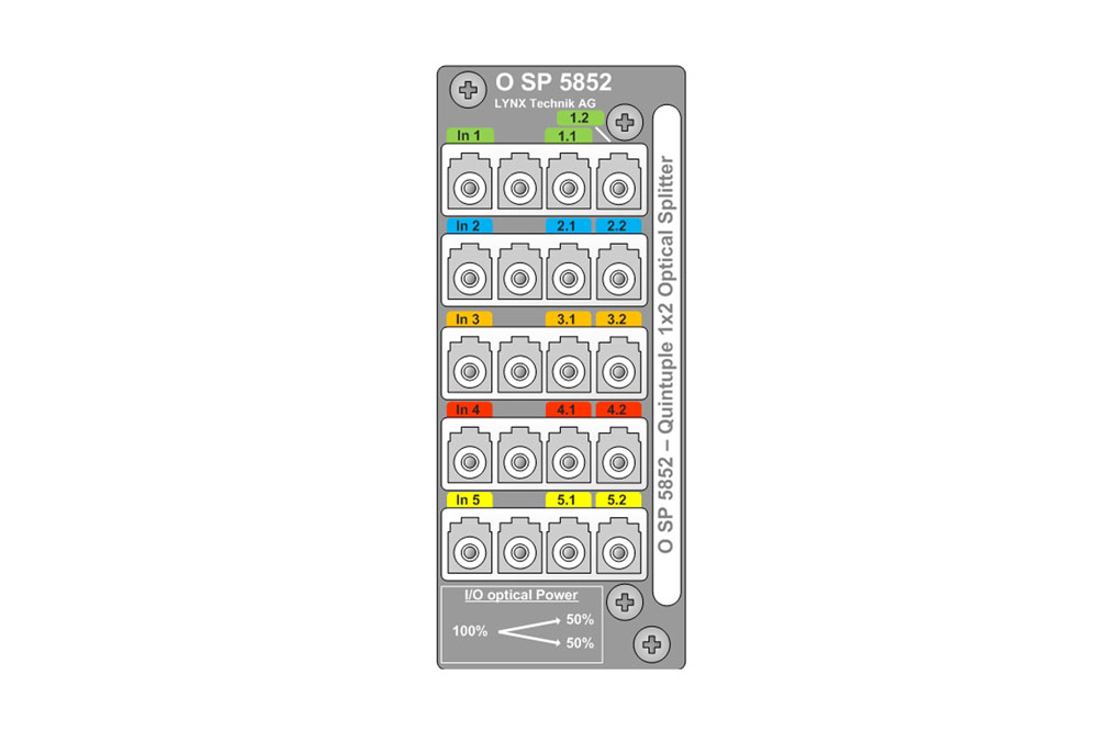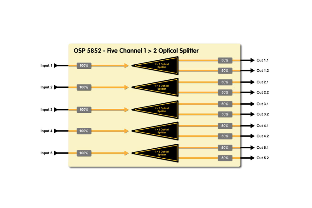 The OSP 5852 M provides 5 independent 1>2 optical splitters / combiners in a single module. For each channel the optical input is split into 2 outputs, each one having 90% of the input power and the other 10% which is useful for monitoring applications.