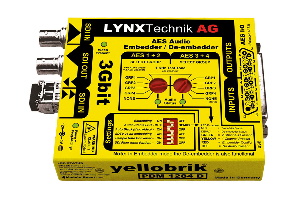 The PDM 1284 D is a versatile AES audio embedder and de-embedder designed for a wide range of SDI video formats up to 3Gbit. It supports balanced AES3 audio I/O using a 25 pin SubD connector.