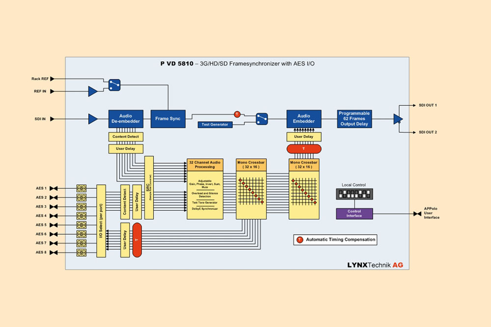 The P VD 5810 is a versatile SDI frame synchronizer with full audio support which can be used to address a variety of synchronization issues in broadcast. The module offers multi-format support for SDI formats up to 3Gbit/s (auto-detect).