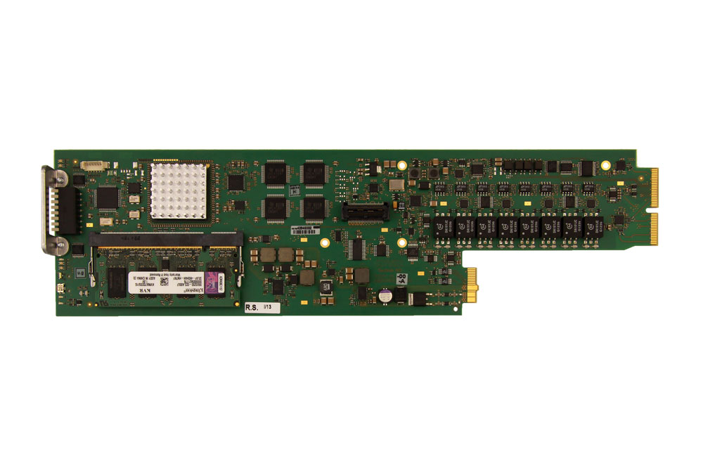 The module utilizes robust “flywheel” synchronization which can accommodate a wide variety of low quality asynchronous SDI sources. Comprehensive audio support includes de-embedding all 16 channels contained in the SDI input plus 16 external inputs. Audio is passed through a 32 channel audio processing stage before being passed into internal crossbars to configure the external audio outputs and the audio embedder. Audio is synchronized to the video automatically and is free from disturbances even when dropping and adding frames. A Dolby E synchronizer is also provided to correctly synchronize and maintain critical guard band alignment.